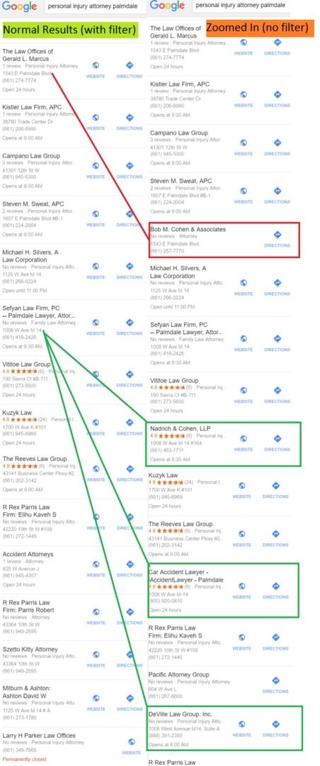 Sie suchen nach “personal injury attorney palmdale” und erhalten 16 Ergebnisse in der lokalen Suche. Es gibt mindestens fünf Profile, die die Adresse 1008 W Ave, Palmdale, California haben und allesamt personal injury attorneys (Anwälte spezialisiert auf Körperverletzungsklagen) sind. Aktuell wird eines der Unternehmen in der lokalen Suche angezeigt und die restlichen vier gefiltert: