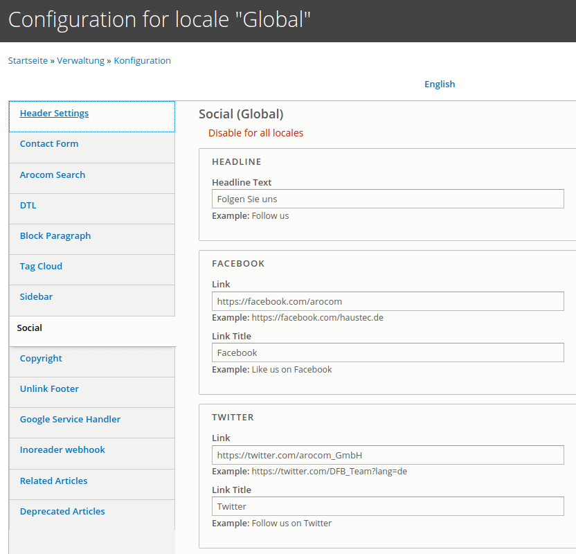 Das Modul “Localized Configuration” bietet eine zentrale Oberfläche für Einstellungen an der Webseite. Es ist ein Framework für Entwickler, die ihre eigenen Features schreiben und diese ohne Mühe zentral & sprach-spezifisch verwalten können wollen.