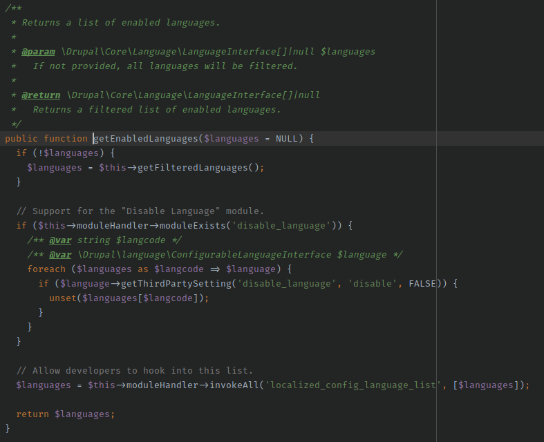 Das namensgebende Feature sind dabei die “Language Overrides”. So kann es - neben dem globalen Standard, der eingestellt ist - auch Abweichungen pro Sprache geben, falls z.B. ein eingestellter Satz übersetzt werden muss. Verwendet man das Drupal-System von “Sprachen” jedoch eher als Ersatz für “Multisite”, kann man z.B. auch für bestimmte Seiten ganze Features an- oder ausschalten, und Verhalten bestimmter Module erheblich ändern.