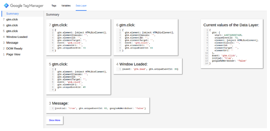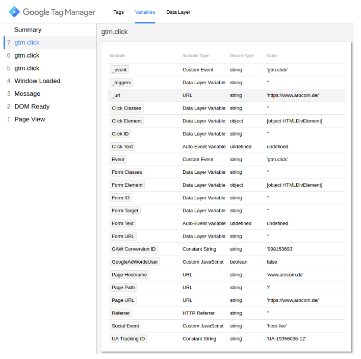 Durch die Auswahl des Reiters “Data Layer” kann entweder eine Übersicht (durch Auswählen von “Summary” in der linken Spalte), oder eine Momentaufnahme (durch Auswählen eines bestimmten Events in der linken Spalte) der Werte innerhalb des “dataLayer” aufgerufen werden.