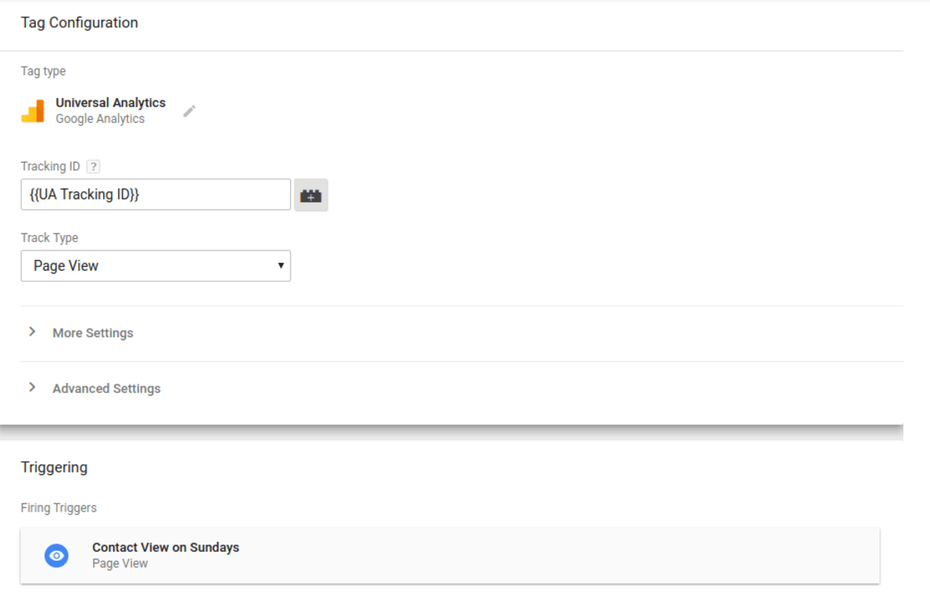 Da die Informationen an Google Analytics weitergeleitet werden sollen, erstellen wir einen entsprechenden Tag. Die Tracking ID kann entweder manuell oder über eine zuvor selbst definierte Variable hinzugefügt werden. Da es um Seitenaufrufe geht, wählen wir als “Track Type” “Page View”. Als letztes wird der zuvor erstellte Trigger hinzugefügt. Wird dieser Tag gespeichert, wird in Zukunft jeder Aufruf der Kontaktseite an Sonntagen an Google Analytics weitergeleitet.