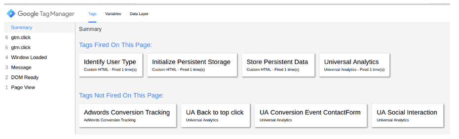 Dieses Menü listet links alle aufgetretenen Events auf, die seit dem Laden der Seite ausgeführt worden sind. Rechts davon ist eine Übersicht der Tags und eine Angabe, ob und wie oft ein Tag ausgelöst wurde.