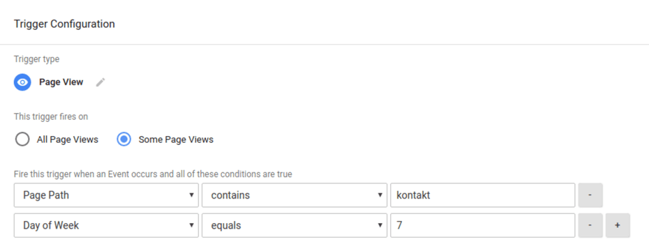 Als nächstes erstellen wir einen Trigger des Typs “Page View”, der bei jedem Aufruf einer Seite ausgelöst wird. Dieser Trigger wird jetzt in Abhängigkeit von zwei Variablen eingeschränkt: Der “Page Path” muss “kontakt” enthalten um sicherzugehen, dass die aufgerufene Seite eine Kontaktseite ist. Zudem muss die selbst definierte Variable “Day of Week” gleich “7” sein. Der komplett konfigurierte Trigger sieht dann so aus: