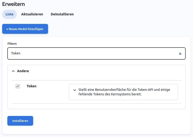 Wählen Sie zum installieren die Checkbox neben dem Modulnamen “Token” aus und klicken Sie anschließend am Ende der Seite auf den Install-Button (“Installieren”). Fertig.