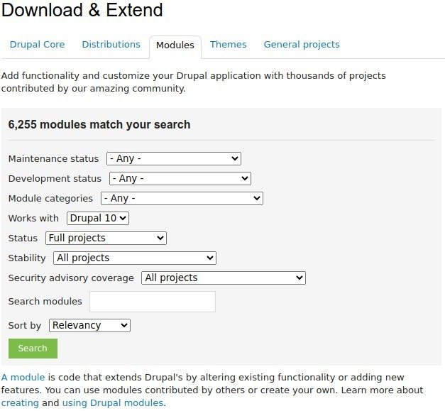In Drupal werden bestimmte Funktionalitäten in sogenannten Modulen bereitgestellt. Das Kernsystem von Drupal 10, auch Core genannt, verfügt über 52 Module. Diese stellen zum einen die Grundfunktionen bereit und erweitern zum anderen den Funktionsumfang um mitgelieferte optionale Module (wie z.B. ein Forum).