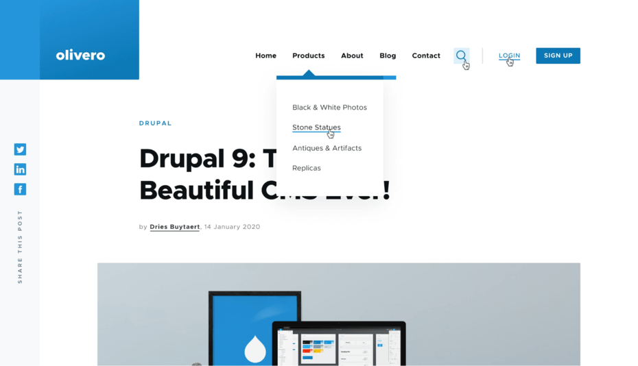 Für die Schöpfer von Olivero war zudem wichtig, die neuesten Drupal-Funktionen, wie beispielsweise den Layout Builder, “Media embeds”, Second-Level Navigation und noch viele weitere bestmöglich zu unterstützen.