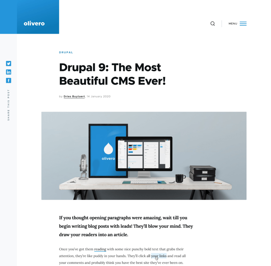 Das und noch vieles mehr verspricht Olivero - das künftige Frontend-Theme für Drupal 9. Da Drupal 9 bereits vor der Tür steht und voraussichtlich Mitte 2020 veröffentlicht wird, werden wir diesen Artikel nutzen, um einen Überblick über Olivero zu gewinnen.