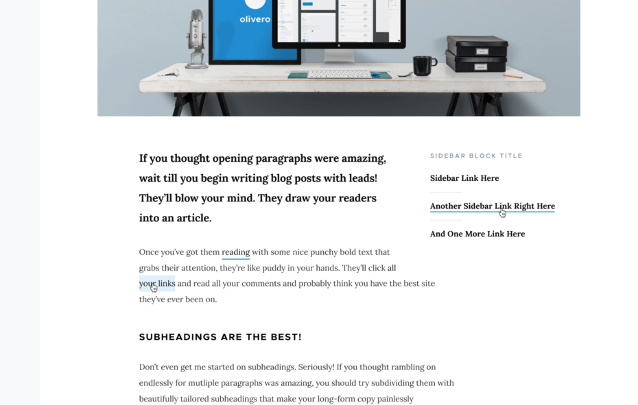 Olivero verfügt über eine Sidebar rechts neben dem Haupt-Content-Bereich der Website, in der beispielsweise verwandte Inhalte hinzugefügt werden können. Durch die Einteilung der verschiedenen Regionen wird der Inhaltsbereich hervorgehoben, während die Sidebar weiterhin als sinnvolle Unterstützung dient.