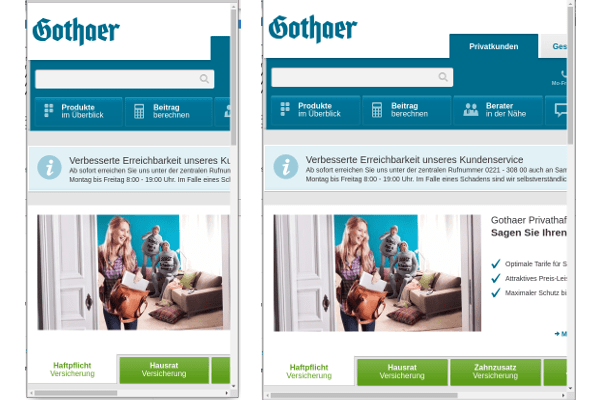 Es ändert sich bei der Verkleinerung nur der Randabstand rechts und links. Die Elemente auf der Seite jedoch bleiben gleich. Sobald diese Größe unterschritten wird, wird ein neues Layout geladen: