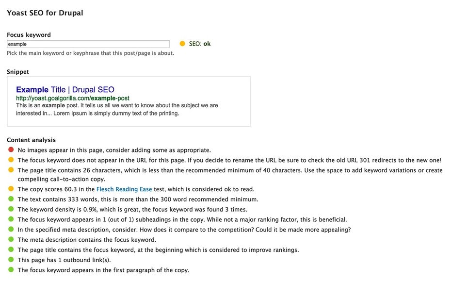 First of all, it should be made clear that this module has nothing to do with Yoast. Together with "Metatag", "Yoast SEO for Drupal" helps you optimize your site by pointing out errors that you should improve: