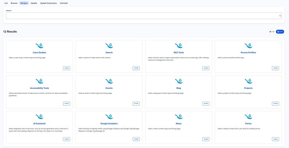 - Blogging-Recipe: Contains modules such as CKEditor, comments and tags as well as predefined SEO settings.