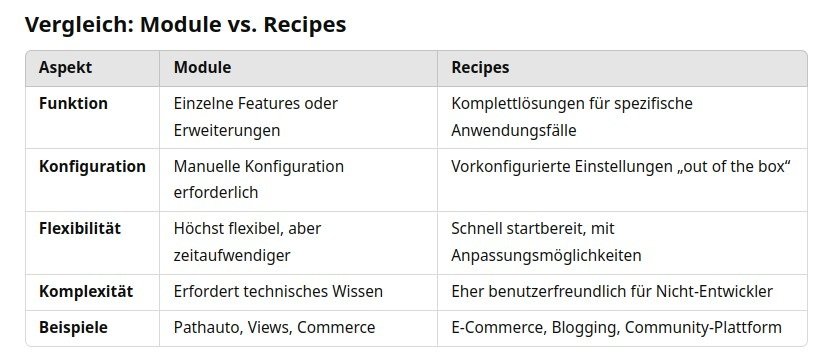Recipes in Drupal CMS are preconfigured sets of modules and associated settings according to the best practices of the Drupal community. They thus represent functions that have been developed specifically for certain use cases and thus make the initial creation of these considerably easier. Recipes therefore offer standard solutions "out of the box".