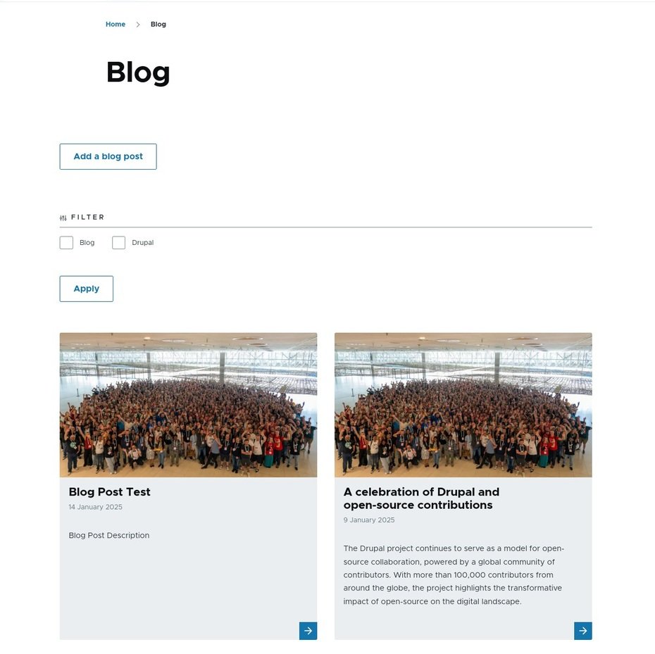 After installing the blog recipe, the new content type "Blog" is added. When creating a blog content, a menu item "Blog" is automatically created with a preset landing page including Dynamic Entity Lists and the self-named tags are listed below. A well thought-out standard blog page is therefore created.