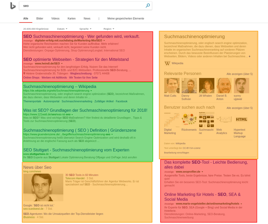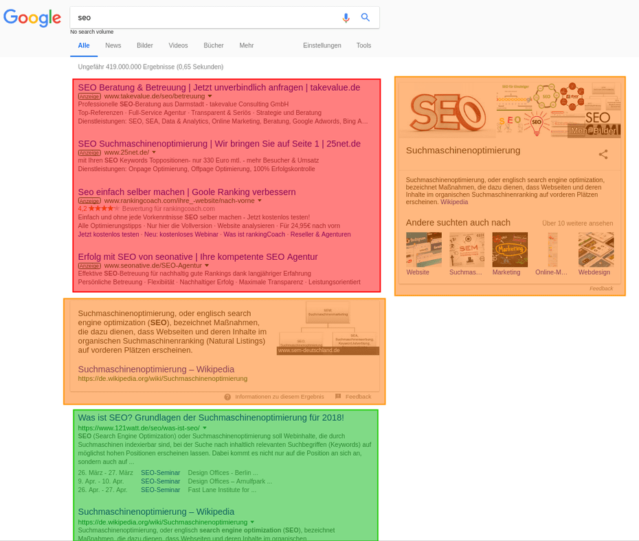 Der rote Bereich besteht aus bezahlten Werbeanzeigen, der grüne Bereich darunter aus organischen Ergebnissen. Der orangene Bereich enthält Featured Snippets oder Ergebnisse aus dem Vertical Search, sofern die Suchmaschine hierfür sinnvolle Ergebnisse liefern kann. Die Suchmaschinen versuchen mit ihren Algorithmen, für den Suchenden das beste Ergebnis zu seiner Anfrage zu liefern. Somit sind Sie als Websitebetreiber "gezwungen", möglichst passenden Inhalt zu den Suchanfragen der Suchmaschinennutzer zur Verfügung zu stellen.