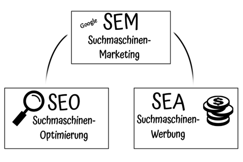 SEM besteht historisch gesehen aus den Disziplinen SEO (Search Engine Optimization - Suchmaschinenoptimierung) und SEA (Search Engine Advertising - Suchmaschinen-Werbung). Während die SEO sich mit den organischen Suchergebnissen beschäftigt, geht es bei der SEA um Text- und Displaywerbung, also bezahlte Suchergebnisse.