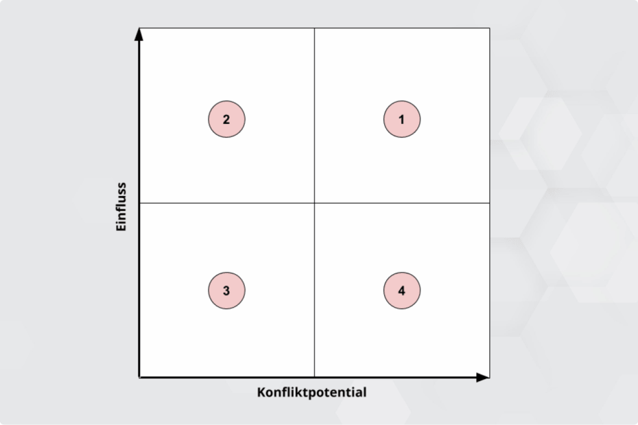 4: Einfluss niedrig, Konfliktpotenzial hoch: Im Gegensatz zu den Stakeholdern des Quadranten 3 sind diese Personen dem Projekt negativ gegenüber eingestellt. Hier gilt es, Personen im Auge zu behalten und die Einstellung zum Projekt zu verbessern.