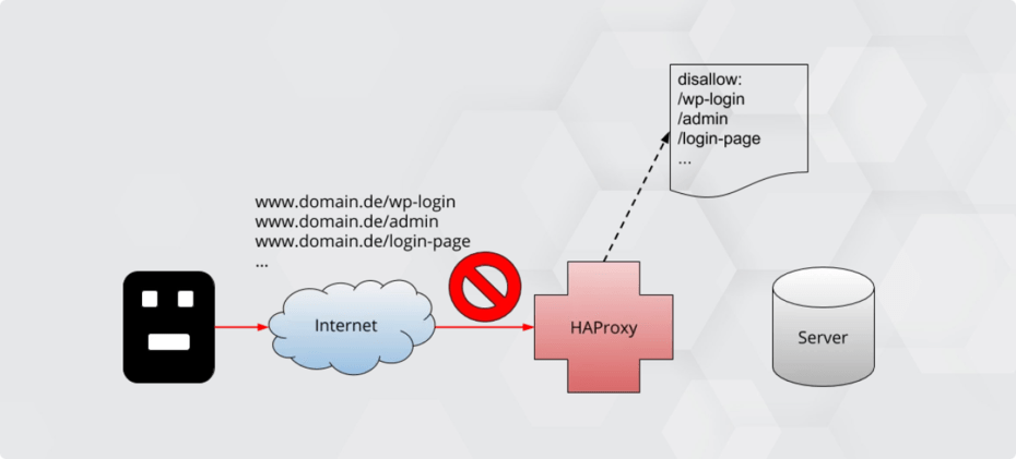 Wollen Angreifer über den Seiten-Login eine Webseite hacken, versuchen sie zum Teil, bekannte Login-URLs der gängigen Content Management Systeme aus. WordPress z. B. hat als Standard-Login-URL “/wp-login”. Auf einer Drupal-Seite lautet die Standard-URL “/user/login”. Eine URL wie “/wp-login” wird es höchstwahrscheinlich nicht geben, der Webserver hätte also unnötige Arbeit. In diesem Fall würde HAProxy so eingestellt, dass bei so einer Anfrage direkt eine 404-Seite zurückgegeben wird, ohne die Anfrage an den Webserver weiterzuleiten.