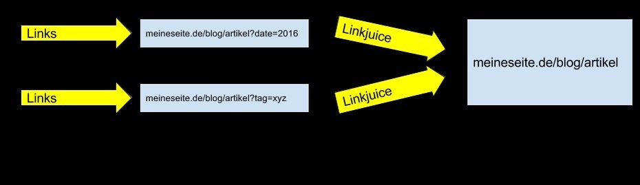Mehrere indexierbare URLs können auch separat verlinkt werden. Hier würden sich Ihre URLs den Linkjuice teilen müssen. Durch das canonical tag wird der Linkjuice aller Versions-Kopien auf das Original gelenkt.