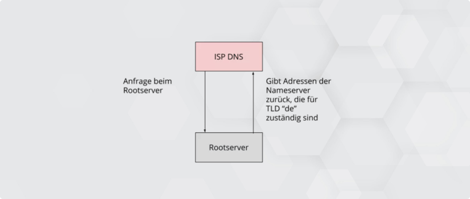 Sollten diese 4 Caches keine Ergebnisse liefern, beginnt eine Abfragekette durch den Domain Name Service des Providers, um die IP-Adresse herauszufinden. Er stellt eine Anfrage beim Rootserver, der die TLD “de” herausliest und dies dem ISP DNS Server mitteilt.