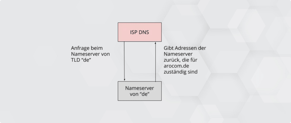 Der ISP DNS Server wird nun den Nameserver der TLD “de” kontaktieren und dort erfragen, wie die IP-Adresse von www.arocom.de lautet. Da dieser in der Regel nicht für diese DNS-Adresse zuständig ist, da er nicht bei der Registrierung angegeben wurde, wird er dem ISP DNS Server denjenigen Nameserver mitteilen, der für die Domain “arocom.de” zuständig ist.