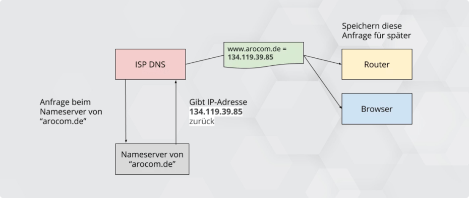 Wenn der ISP DNS Server nun beim DNS-Server der Domain arocom.de anfragt, wird dieser, da er für die Domain zuständig (autorativ) ist, mit der IP-Adresse antworten. Außerdem speichern der ISP DNS Server, Router und der Browser diese Information für spätere Aufrufe der DNS-Adresse www.arocom.de.